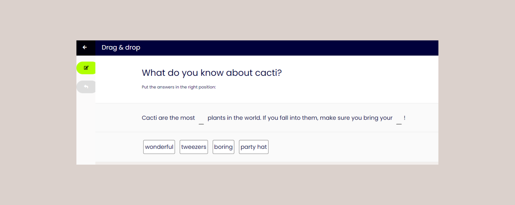 Drag-and-drop questions: Have learners move elements to the correct place to test their understanding