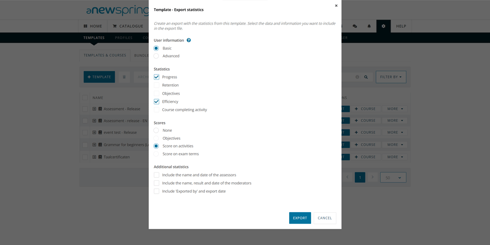 Lastly, administrators are able to export the progress and statistics of the entire moderation flow. By doing so, they are able to see how much a learner has scored on an activity, who assessed them, who moderated the assessment, and on which date the activities were completed. The data can be exported per template, per course or via the instructor dashboard. This makes it very easy to submit information to a third party stakeholder.