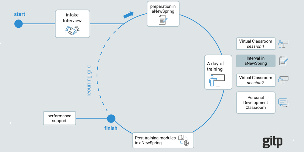Understanding the importance of integrating the training in the learner’s minds in the long term, GITP uses aNewSpring to offer a program of post-training modules to help learners stay on track and optimise the enduring benefits of the training. Learners also receive performance support such as coaching on particular situations, and weekly tips they can apply to their day-to-day professional activities.